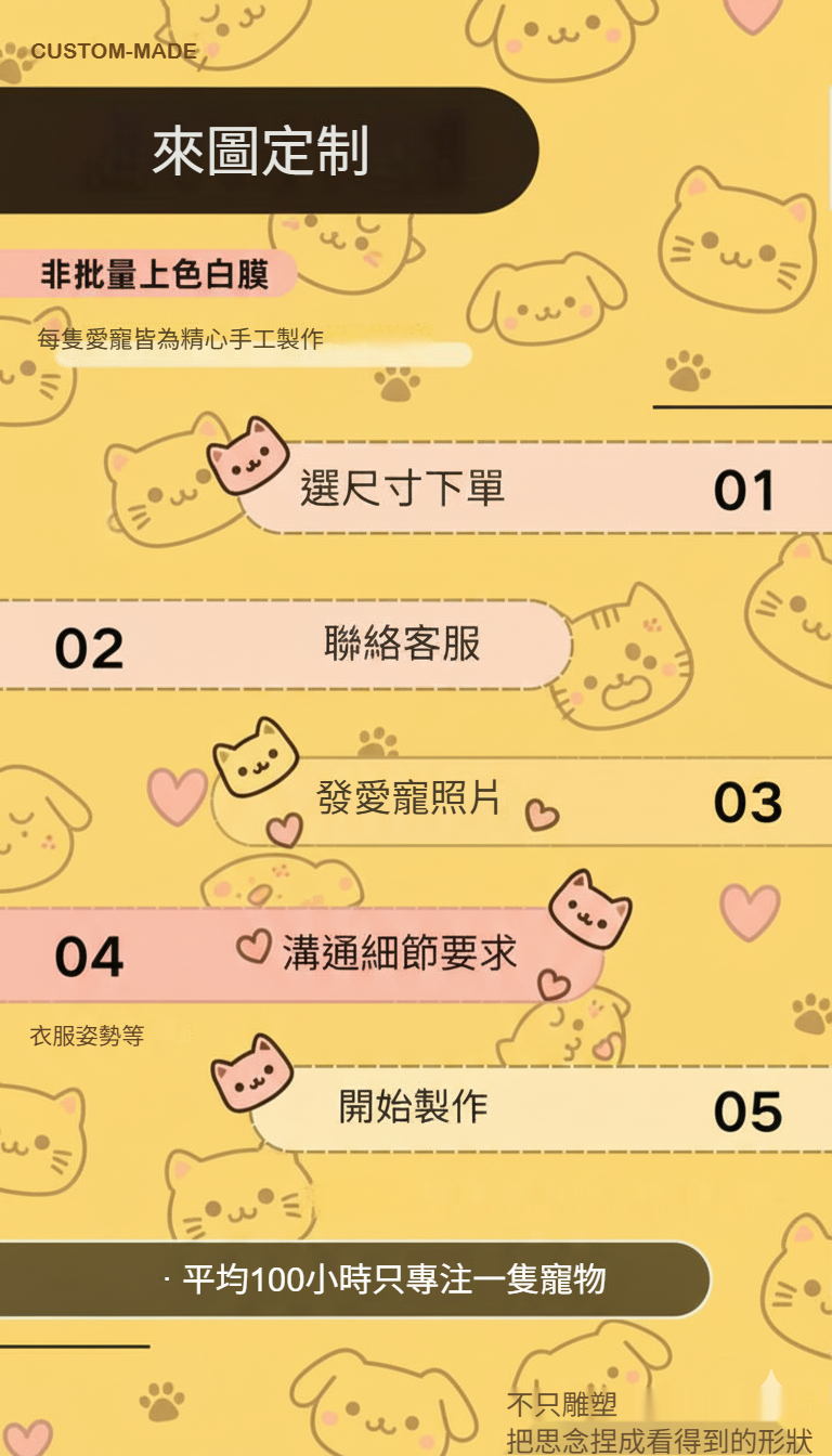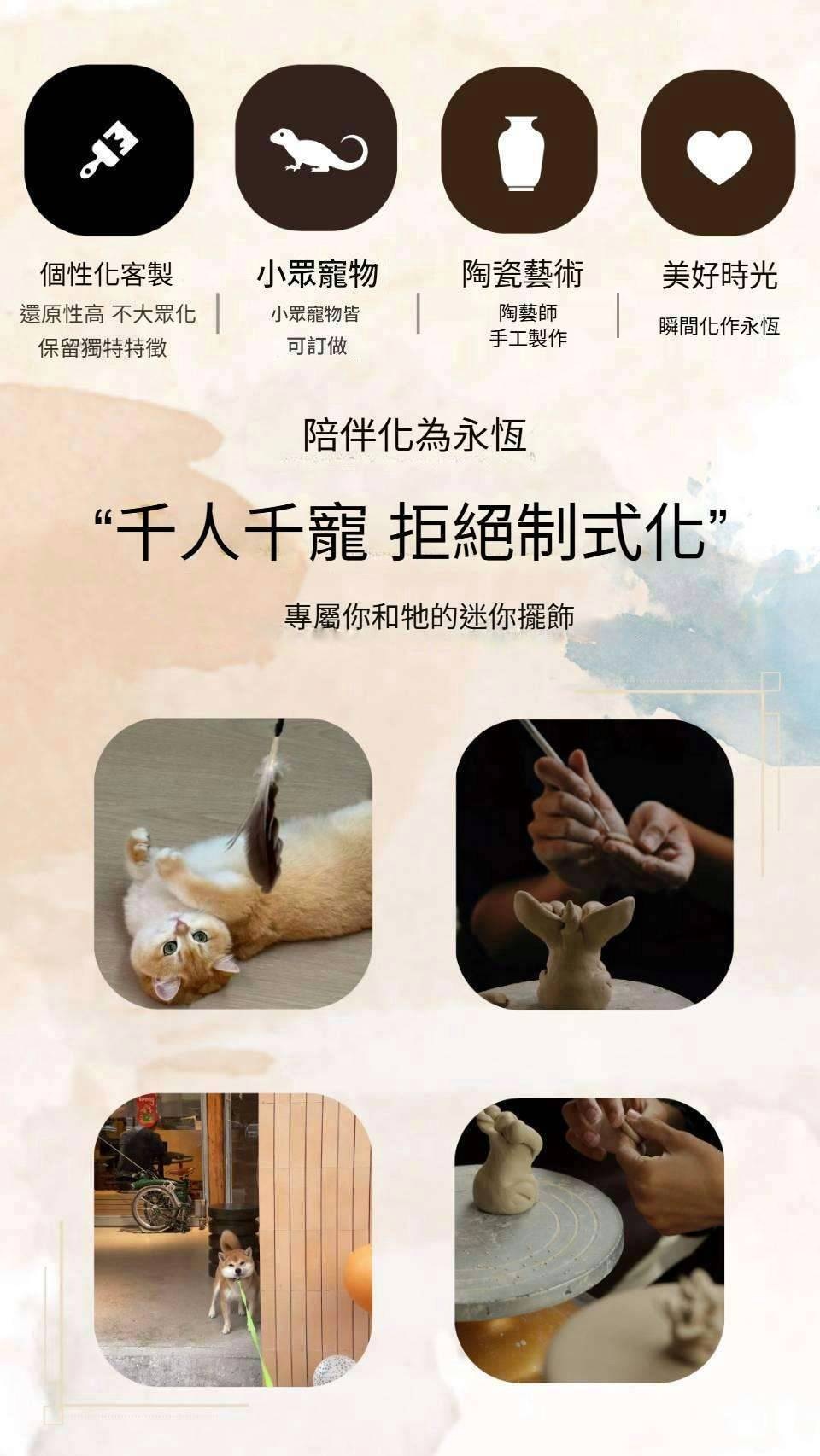 我們用高級的白瓷土,經由師傅全程純手工製作。復刻毛小孩的鬍鬚彎度到腳掌肉球的紋路!