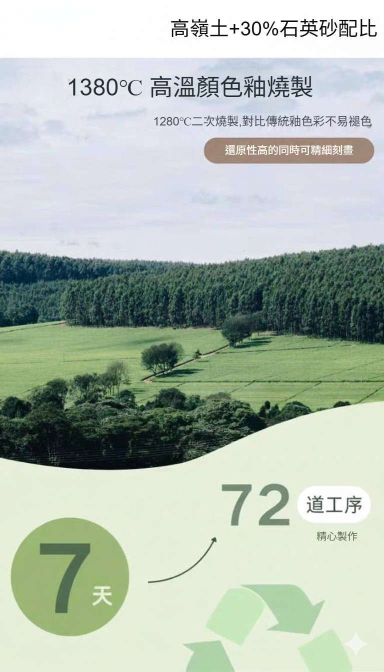 材質與工藝: 高級白瓷土、純手工、1380°C 高溫。